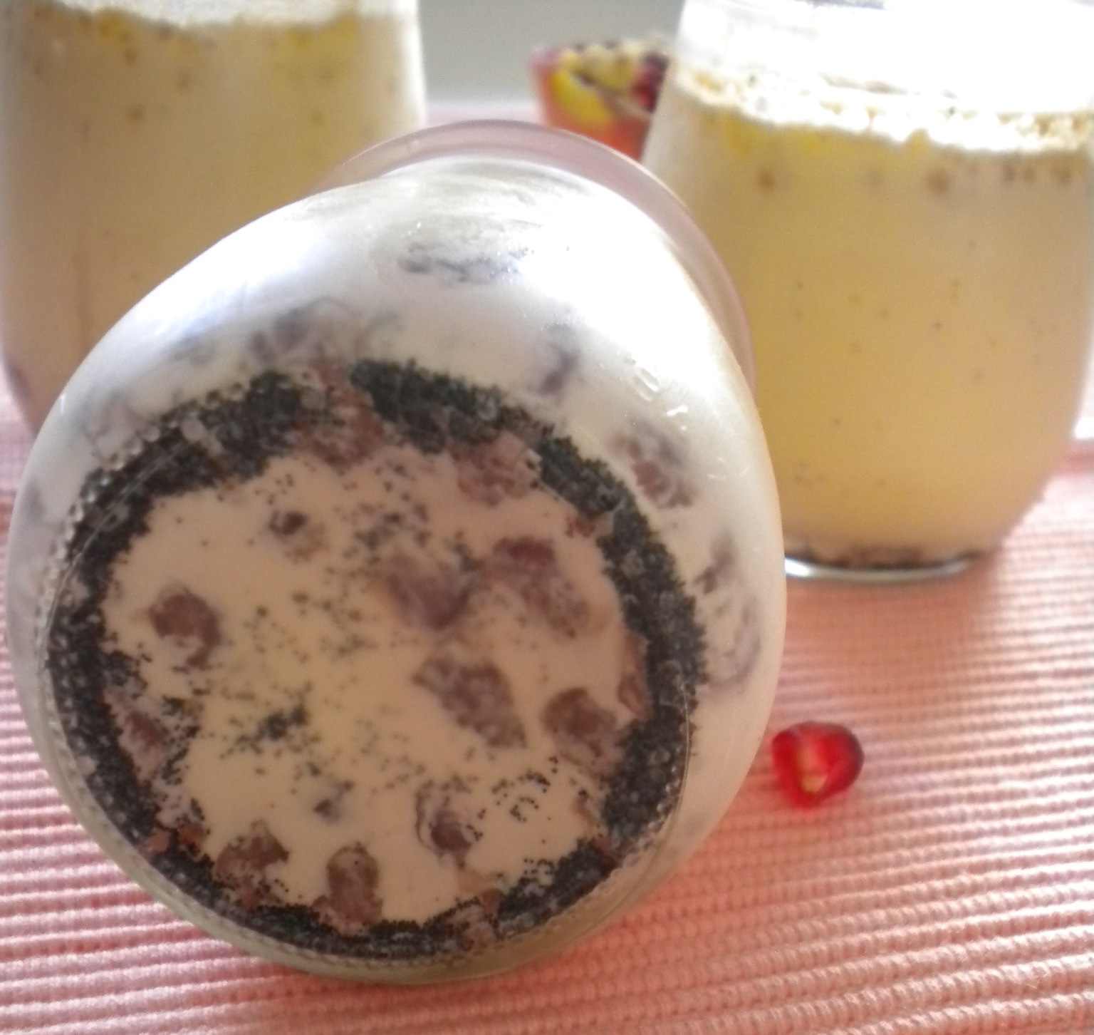 Ao invés de ramequins usei potinhos de iogurte para ver melhor o efeito dos bagos de romã e das sementes de baunilha.