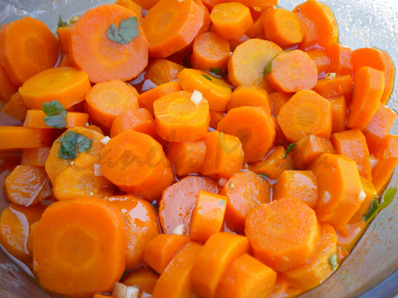 Descascam-se os alhos e picam-se. À parte, numa vasilha apropriada, deitam-se as cenouras. Temperam-se com o alho, o colorau, a salsa, o vinagre, o sal e a pimenta.