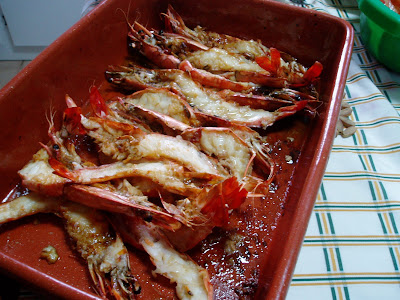 Eu adoro tudo que seja camarões e pus-me logo a procurar algumas receitas para ver qual me agradava mais. Encontrei algumas que envolviam fritura e eu queria assado ou grelhado. Acabei por levá-los ao forno após uma sessão de intensa batalha para cortar os bichos ao meio. Sim, porque nesta casa usam-se facas mas as ditas não cortam nada para que, quem as manuseia não corte os dedos (a história tem fundamento, comprei uma faca o ano passado e cortei os dedos todos). Mas passei o tempo todo a dizer palavrões com sotaque do norte e tudo... é que os bichos picam e se a faca não corta ainda é pior.