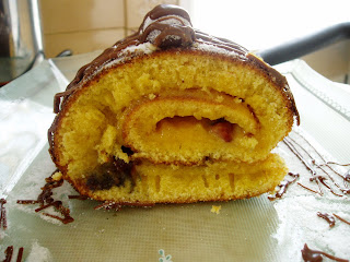 Barrei o bolo com o creme de pasteleiro e polvilhei com cinco cerejas picadas (acho que mais ficava melhor). Enrolei a torta com a ajuda do papel vegetal (não foi preciso o pano para ajudar) e aparei as pontas. Não usei, mas pode cobrir-se com as natas batidas com 2 colheres de açúcar. Eu polvilhei com açúcar em pó. Derreti o chocolate com um pouco de leite no microondas. Como ainda não tenho saco de pasteleiro (aiiiiii, que tristeza! Comprei um rafeiro que se desfez na primeira utilização, a culpa não foi minha ok?) pus o chocolate numa saca plástica e cortei a ponta. Fiz risquinhas por cima da torta e depois pus as cerejas em fila. Pus chocolate em cima das cerejas. E prontinho :)
