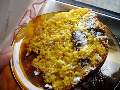 Misturei os bocadinhos de chocolate e deitei o preparado numa forma redonda de buraco, devidamente untada e polvilhada.