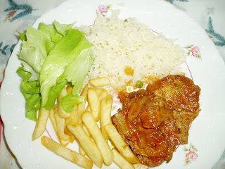 Foi acompanhado de arroz que chamei de 3 porque foi feito com ervilhas, pedacinhos de bacon e cenoura. Na minha opinião, não se deve colocar o bacon no arroz porque já tinhamos a carne do lombo. Mas ficou delicioso e até acabou por ficar insosso. Creio que o arroz não preciso de dizer como se faz... Também aconcheguei o prato com batatas fritas (Há quem não como batatas quando há arroz e vice-versa. Nesta casa marcha tudo porque o problema é emagrecer e não engordar e quantos mais hidratos mais energia ;-)