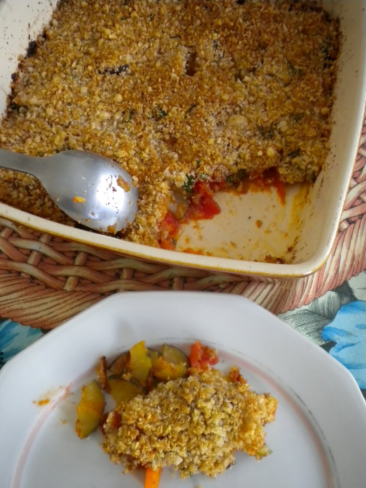 Ligue o forno nos 200 ºC. Misture as migalhas de pão com o queijo e a salsa, e polvilhe por cima da mistura de courgette. Leve ao forno durante 20-30 minutos, até estar estaladiço e dourado por cima. Sirva de imediato. Se preferir, pode cozinhar a cobertura sob um grelhador ligado na posição média, até estar num tom entre o dourado e o tostado.