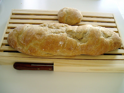 Fiz em forma de baguete para depois de ficar duro fazer umas fatias de pão de alho, mas foi impossível. O pão não ficou duro e fui comendo com compota de figo, dica da