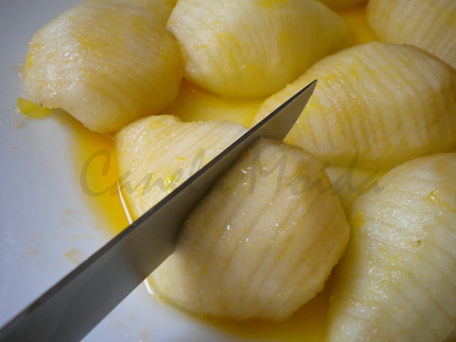4- Seque as pêras em papel de cozinha e coloque-as em círculo sobre a massa pressionando ligeiramente.