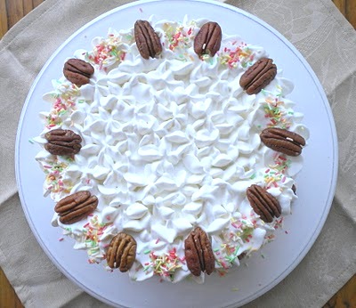 Para este bolo usei duas formas de 18 cm de diâmetro. Dividi cada bolo ao meio e obtive um bolo de 4 andares. Recheei cada camada de bolo com as natas e na camada do meio, antes das natas, passei uma camada de compota de framboesa. Continuei até terminar e depois cobri com as natas restantes. Depois usei um saco de pasteleiro para confeitar, decorei com nozes pecãs e confeitos coloridos.